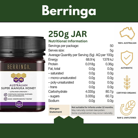 Berringa Super Manuka Honey MGO 900+ 250g – Pure & CertifiedVendor:iSage HealthRegular price $125.00 AUDRegular priceUnit price / per-